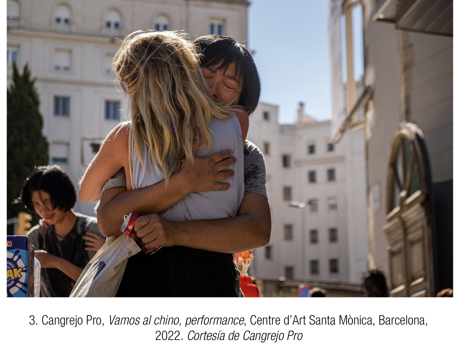 La performance colectiva Vamos al chino deviene un dispositivo para denunciar la sinofobia de la sociedad española y se ha llevado a cabo en diferentes enclaves, adaptándola en cada uno de ellos, como en el Centro de Creación Artística Matadero en Madrid, dentro del II Encuentro de la Diáspora China en España (2 de abril de 2022), delante del Centro Arts Santa Mònica en Barcelona (2 de octubre de 2022), en el marco de los VIII Encuentro Cultura y Ciudadanía en Sevilla (26 de octubre de 2022), en el Festival de Cultura Feminista en San Sebastián (2 de diciembre de 2023) y en el Museo del Traje de Madrid (20 de junio del 2023). Me centraré en la acción llevada a cabo en Barcelona [2], frente a una audiencia especialmente heterogénea. Cangrejo Pro, en la convocatoria de la acción, enuncia el deseo que esta pieza siga fermentando en espacios públicos, en centros escolares y en espacios escénicos puesto que uno de los objetivos finales es interpelar a la sociedad.