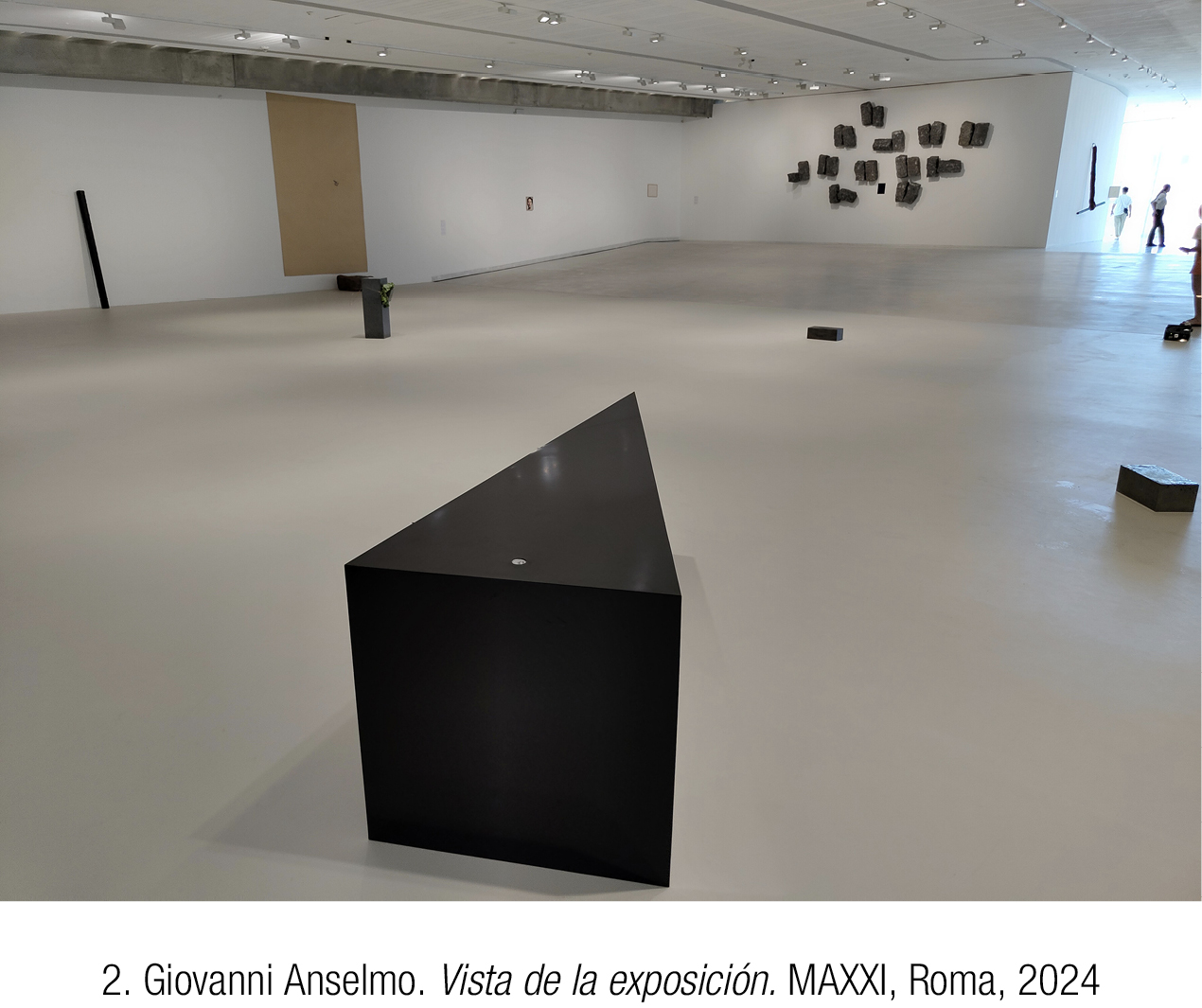 Toda la carrera de Giovanni Anselmo está determinada por un instante: el momento en el que una mañana de agosto de 1965, en la cima del volcán Estrómboli (Sicilia), cuando la primera luz del sol proyectó su sombra hacía la inmensidad –el sol estaba en el mar y su contorno había desaparecido en el infinito–, adquirió conciencia de ser parte de un universo en transformación. La cognición de su papel dentro de la naturaleza, con la consiguiente dificultad de representación de algo que era consecuencia de una experiencia personal, le llevó a reflexionar sobre una narrativa capaz de recrear esa observación. En este sentido, como alegoría y resumen de toda su producción, La mia ombra verso l’infinito dalla cima dello Stromboli durante l’alba del 16 agosto 1965, se proyecta en la antesala de la muestra Oltre l’orizzonte, una retrospectiva de Giovanni Anselmo, comisariada por Gloria Moure, que ha sido producida por el Museo Guggenheim de Bilbao en colaboración con el MAXXI de Roma [1].