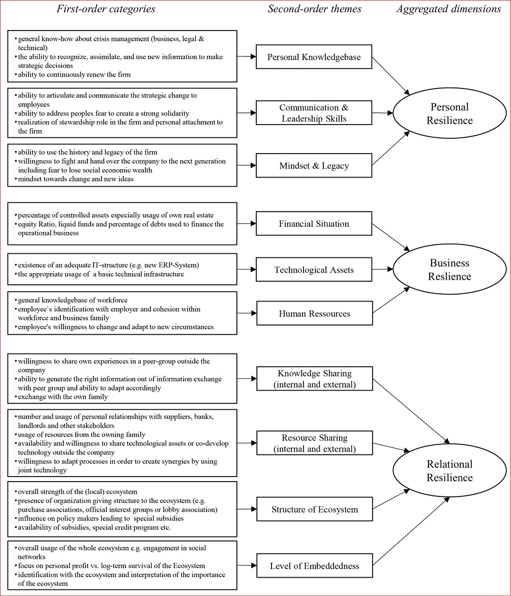 We contribute to existing research in various ways. First, we enhance research on resilience by empirically extending the understanding of resilience and identifying three dimensions of resilience, namely personal, business, and relational resilience, which mutually influence each other. In doing so, we especially highlight the multidimensionality of the resilience concept, helping to refine existing conceptualizations and diverging research (Ventura et al., 2020). We also extend the understanding on the relationship between these dimensions (Santoro et al., 2021). Especially the relational dimension of resilience offers rich insights into the functioning of family businesses after a crisis, extending the relational benefits of family business owner-managers beyond the family and the business. Reaching high levels of relational resilience, especially through resource sharing and knowledge sharing, highly enhances the quality of crisis response.