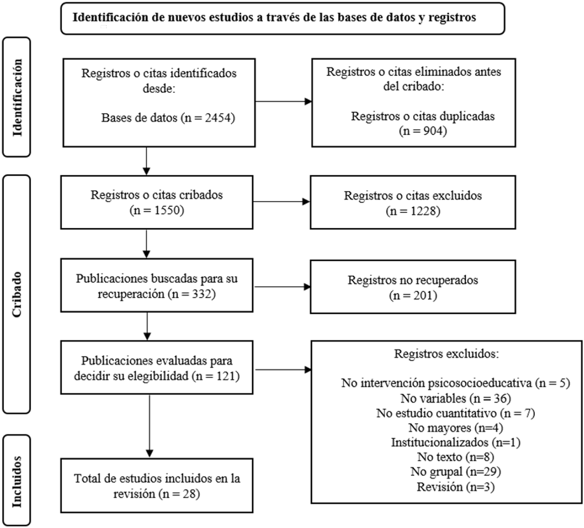 Una vez realizada la búsqueda, se procedió a la fase de identificación, en la que se eliminaron 904 artículos debido a que estaban duplicados. Por lo tanto, para la fase de cribado contamos con 1550 documentos, de los cuales se descartaron 1228 únicamente a través de la lectura del título. Quedaron 322 estudios para la lectura de su resumen, tras la cual y basándonos en los criterios de inclusión y exclusión descritos anteriormente, se descartaron 201 artículos, quedando 121 para su lectura completa. Tras la lactura completa, descartamos 93 por diversas razones: no era una intervención psicosocioeducativa (n = 5), no abarcaba las variables de estudio (n = 36), no era un estudio cuantitativo (n = 7), las personas cuidadas no eran mayores (n = 4), las personas mayores estaban institucionalizadas (n = 1), no estaba disponible el texto para su lectura completa (n = 8), la intervención no era grupal (n = 29), el artículo se trataba de una revisión (n = 3). No se añadió ningún artículo identificado por otros métodos, como la búsqueda de citas o la búsqueda manual. Por lo cual, tras esta fase quedaron 28 artículos para ser incluidos en la revisión sistemática. Las distintas fases del proceso de selección de artículos se pueden observar en la Figura 1.