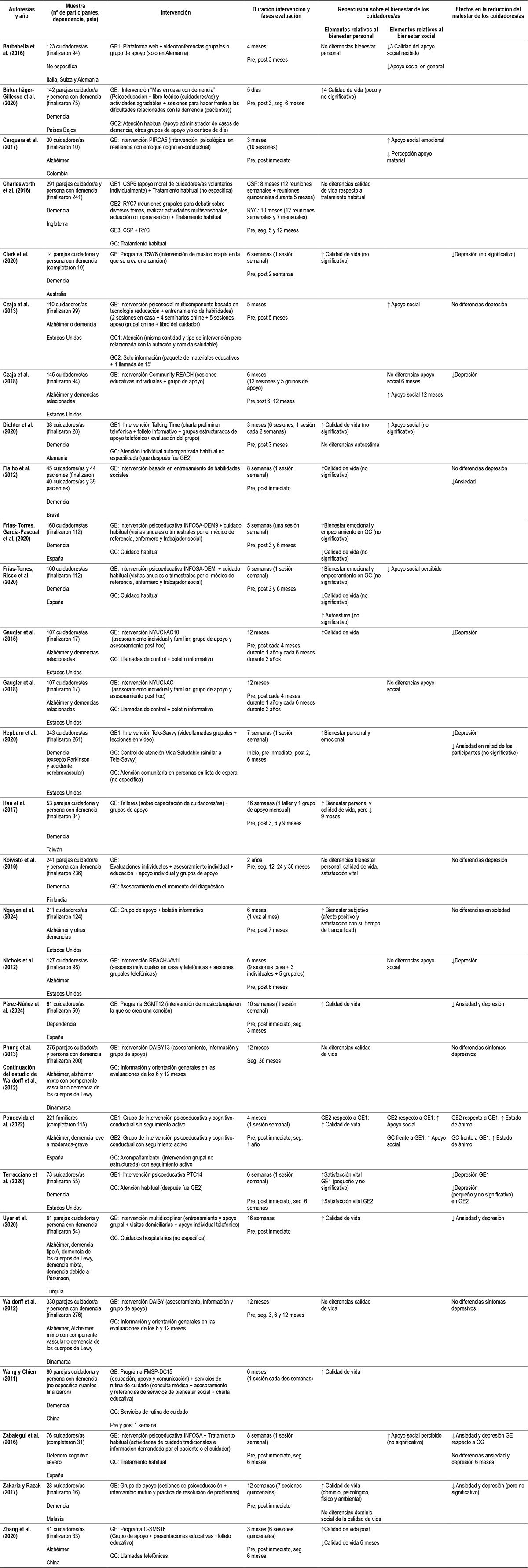 En los últimos quince años, varios estudios han abordado el tema de las intervenciones psicosocioeducativas en cuidadores/as de personas con dependencia. Respecto a los efectos de estas intervenciones, se centran en las consecuencias en la depresión, en la ansiedad o la carga (Liu et al., 2022; Frias et al., 2020; Mårtensson et al., 2023; Martín-Carrasco et al., 2014; Orgeta et al., 2015; Teahan et al., 2020; Piersol et al., 2017; Stoner et al., 2021), la autoeficacia relativa al cuidado (Tang y Chan, 2016), el distrés (Hansen et al., 2022) o la resiliencia (Qureshi et al., 2023). En cuanto a los tipos de intervenciones, hay estudios que se han centrado de forma específica en las intervenciones online (Parra-Vidales et al. 2017; Zhu et al., 2021; Boots et al., 2014; Waller et al., 2017; Scerbe et al., 2023), en la activación conductual (Zabihi et al., 2020), en el mindfulness (Kor et al., 2018), en el apoyo de pares (Carter et al., 2020) o en la terapia diádica (Poon, 2022; Ghosh et al., 2023). Sin embargo, no existe ninguna revisión sistemática que se centre específicamente en investigar cómo afecta cualquier tipo de intervención psicosocioeducativa en aspectos más positivos como son el bienestar personal y social, dándoles a estos resultados un papel principal y dejando en un segundo plano el análisis de los efectos en la reducción de los problemas vinculados a la salud mental o la reducción del malestar.