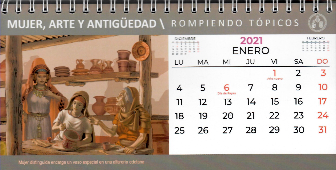 Además, estas imágenes han sido empleadas para la creación de los calendarios Mujeres, Arte y Antigüedad: Rompiendo Tópicos tanto de 2021 [Figs. 3 y 4] como de 2022 [Figs. 5 y 6], que en este caso no solo han contado con el apoyo de la Unitat d’Igualtat, sino también del Servicio de Formación Permanente e Innovación Educativa de la UV a través del Plan de Innovación de la Facultad de Geografía e Historia. Se pretende con ello crear un producto que sirva para dar visibilidad al contenido impartido en estos encuentros y que, de esta manera, pueda salir también de las aulas.