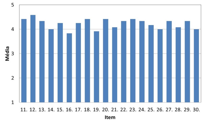 Os valores médios observados apresentam as variações ilustradas, em média, a concordância é superior para “33. Considero importante que o estudante escolha o tema a investigar”, seguido de “39. Tenho enfatizado à prática pedagógica baseada no construtivismo baseada na investigação científica, dando (- lhe) a oportunidade de pôr em prática as teorias aprendidas” e “41. Fomento o trabalho autónomo, responsável e cooperativo entre os estudantes, mostrando-se disponível para apoia - los e esclarecer dúvidas” e depois de “34. Preocupo - me em orientar, acompanhar e apoiar de forma clara o estudante sobre os procedimentos nas diferentes etapas e fases do processo da investigação” e “36. Sinto necessidade de planear actividades baseadas nas experiências de leitura de investigações e artigos científicos significativos, que auxiliem a aprendizagem do currículo”; sendo os valores inferiores para “38. Adapto estratégias de ensino diversificadas em sala de aula com a utilização de actividades de leitura de (investigações e artigos significativos) aprendizagem em situações activas na orientação da(s) monografia(s)” e “40. Solicito com frequência as opiniões dos meus colegas sobre o(s) tema(s) que estou a tutorar”, tendo todos os itens uma concordância claramente superior ao ponto intermédio da escala de medida.