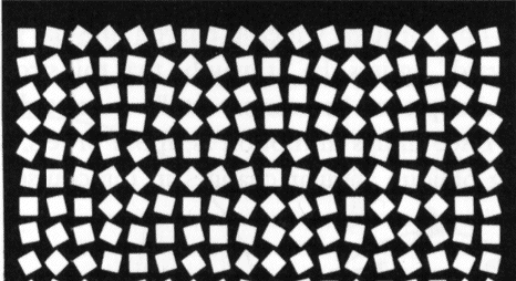 Look now Figure 10. It has 16 squares arranged in a four by four array, where each square is rotated 22.5 degrees with respect to a neighbor square. This Figure does not generate the dynamic pattern illusion in a human observer, and therefore we can agree that its complexity is less than the complexity of figure 1. However next to it there is Figure 11, which is exactly Figure 10 repeated four times towards the right and four times to the bottom of the page. Even though figure 10 does not generate the dynamic pattern illusion, Figure 11 does generate the dynamic illusion. Therefore, the act of repetition of the same figure generates a figure of higher complexity. This emergence of higher complexity shows again the dependence on the format and observer´s perceptual, motor and cognitive system. Since figure 10 doesn´t generate a dynamic phenomenon a textual description of figure 10 would seem to be enough to compute its complexity. Then a textual description specifying the successive repetition of figure 10 would be enough to describe figure 11. But this is not so. It is required to do the repetition in the adequate visual format and then look at the formed figure 11 to appreciate that the complexity is more than just the complexity of the seed figure 10 repeated 16 times.