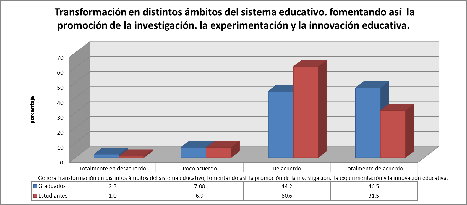 Sobre este aspecto, la respuesta de los estudiantes y los graduados nuevamente se agrupa en un alto nivel, en De acuerdo y Totalmente de acuerdo, 92.1% y 90.7%, respectivamente. Desde esta perspectiva, se puede inferir que la propuesta de formación de pedagogos infantiles UNIMINUTO, desarrolla capacidades en sus estudiantes para generar transformaciones en distintos ámbitos del sistema educativo, fomentando así la promoción de la investigación, la experimentación y la innovación educativa.