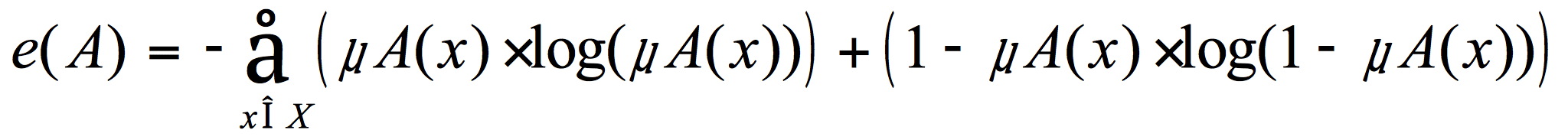 x) Entropía: la entropía sirve para evaluar cuan difuso es un conjunto difuso, es decir poseer medidas de difucidad. Si X es finito la entropía se calcula de la siguiente manera: