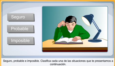 El recurso muestra una serie de ejemplos de situaciones relacionadas con el azar, distinguiendo en sucesos imposible (que un coche funcione sin gasolina), suceso probable (que un perro encuentre un hueso escondido por otro perro) y suceso seguro (sacar un caramelo de menta de una bolsa que solo tiene caramelos de menta). Una vez terminada la animación, se pulsa el botón siguiente, planteándole al usuario una serie de 8 cuestiones de opción múltiple, en donde debe distinguir entre sucesos probables, seguros o imposibles. Una vez elegida la opción, si la respuesta es correcta, se felicita al estudiante y se debe pulsar el botón siguiente para seguir contestando el cuestionario. Si la respuesta no es correcta, se le solicita al estudiante que vuelva a intentarlo.