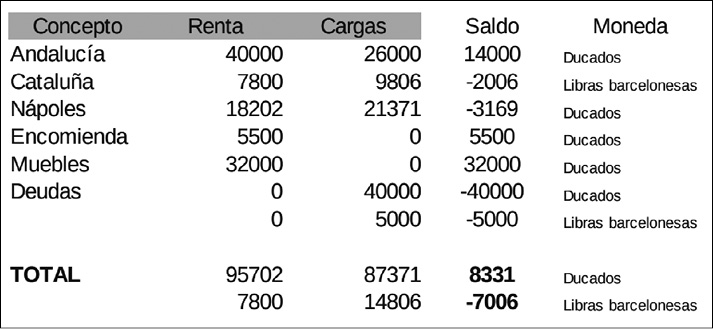 Una casa como la de Sessa, que se había sustentado sobre todo con el botín de guerra del reino de Granada primero19 y de los territorios italianos después, vio como sus rentas eran cada vez menos rentables y no podían hacer frente al excesivo gasto que conllevaba una casa de la Grandeza de España.