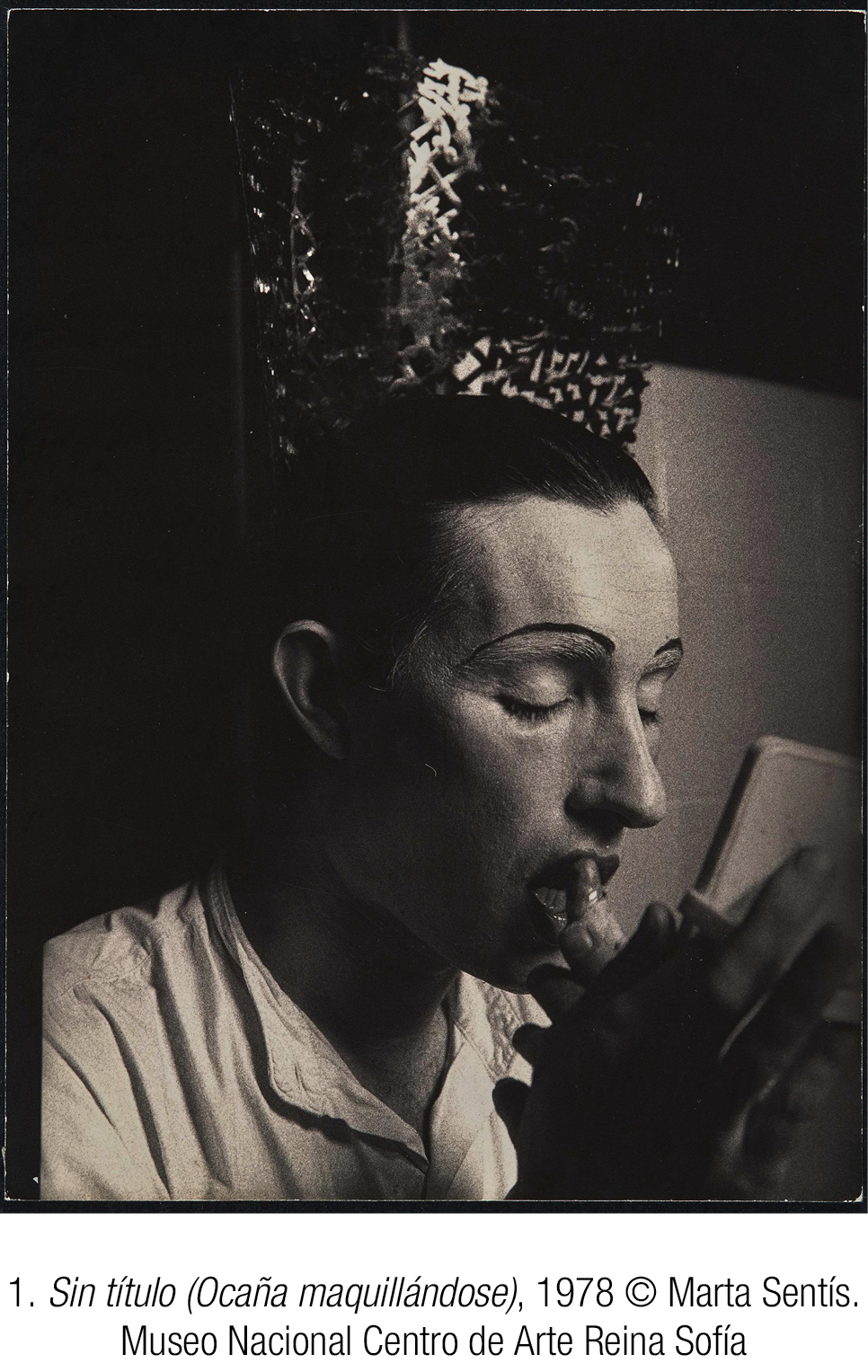 En una fotografía de 1978, Ocaña aparece maquillándose [1]. Se ha dibujado unas cejas finas, arqueadas, y la cámara lo captura en el momento de aplicarse el pintalabios. Sostiene un espejo de mano; en su rostro de expresión absorta, los ojos parecen cerrados. Es una imagen plácida. Ocaña permanece aparentemente ajeno al hecho de estar siendo fotografiado. No asistimos a la puesta en escena del personaje, ostentoso y procaz, sino a su creación, en un primer plano teñido de intimidad. En el cabello recogido lleva prendida una peineta que, en acusado protagonismo, acapara el tercio superior de la fotografía.