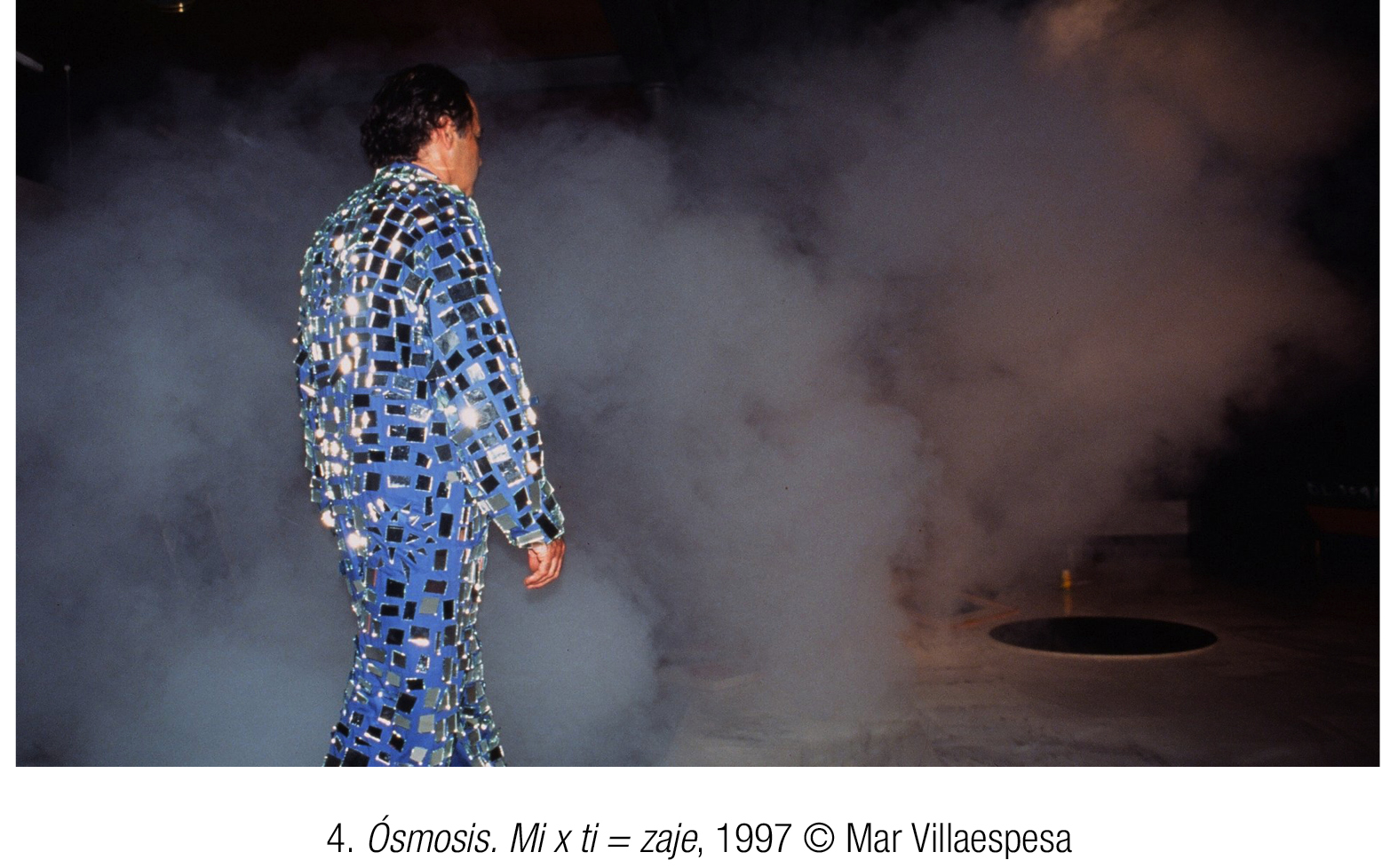 Miguel Benlloch irrumpe, envuelto en destellos, en el Museo Marítimo de Ceuta. Es 1997 y lleva por primera vez el traje de espejos que se convertirá en una de las prendas recurrentes de su vestuario. Está realizada a partir de un mono de trabajo, en recuerdo una vez más de los entretenimientos proletarios del café cantante. Pero su danza desmañada, delante de una patera recubierta de papel de plata, resulta triste. Se trata de Ósmosis. Mi x ti = zaje [4], una obra perteneciente al proyecto Almadraba, dedicada al flujo migratorio en el Estrecho de Gibraltar. El resplandor del traje bajo los focos hace pensar en la belleza engañosa del Mediterráneo, en el rastro trágico dejado en él por quienes tratan de cruzarlo.