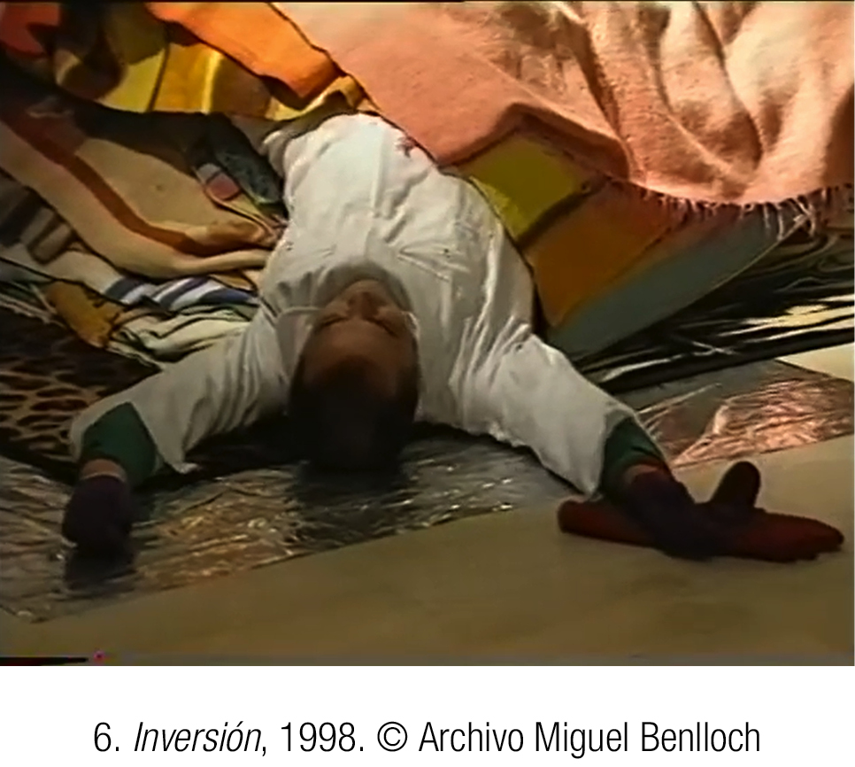 Benlloch emerge, arrastrándose lentamente, de una pila de cien mantas prestadas por personas de su entorno. Su yuxtaposición origina ese espacio seguro y reconfortante que creamos junto con quienes nos rodean y que es el punto de partida de toda búsqueda de la propia identidad. Al desprenderse de la ropa que lleva puesta, mientras se yergue y camina, el artista se despoja de los miedos e imposiciones que lo oprimen. Finalmente, el cuerpo liberado, cubierto tan solo por la minifalda de lentejuelas, se encuentra con el hielo en forma de pechos femeninos. En ese intercambio entre el calor del cuerpo arropado y el frío liberador, las fronteras entre los géneros son de nuevo derogadas. La exploración de las propias necesidades, interrogaciones y diferencias que representa Inversión culmina cuando se es capaz de lanzarse a la vida vivida con los/as demás.