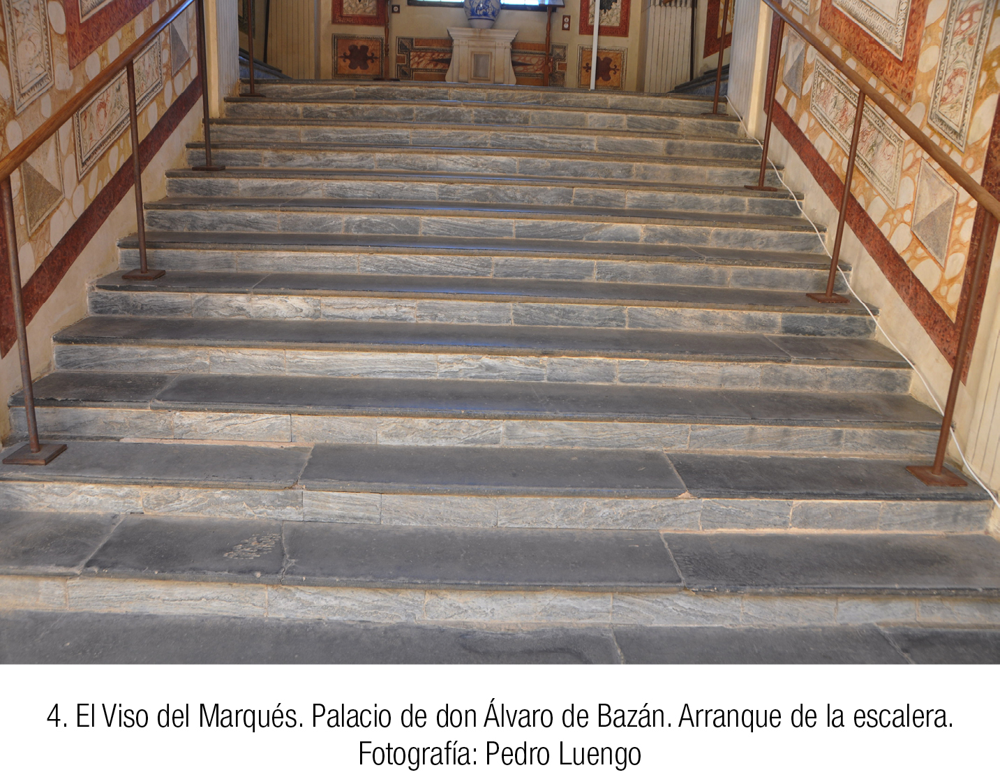 Las veintisiete cajas de pizarras que se referencian en el documento debieron contener las losas que, combinadas con piezas de mármol blanco, constituyen el pavimento de los rellanos de la escalera imperial. En el primero las baldosas son cuadradas, blancas y grises, de igual tamaño, dispuestas en diagonal y alternando en hileras por colores [6]. En los restantes las losas de pizarra son octogonales y algo mayores, situándose en los ochavos pequeñas piezas blancas, una fórmula que era característica de los palacios genoveses (López, 2009: 206). Dicha composición geométrica es una simplificación del modelo que para techumbres de madera recoge Serlio en una de las láminas de su Libro Cuarto, que tan amplia difusión alcanzó (1552, fol. LXXV vto.) [7].