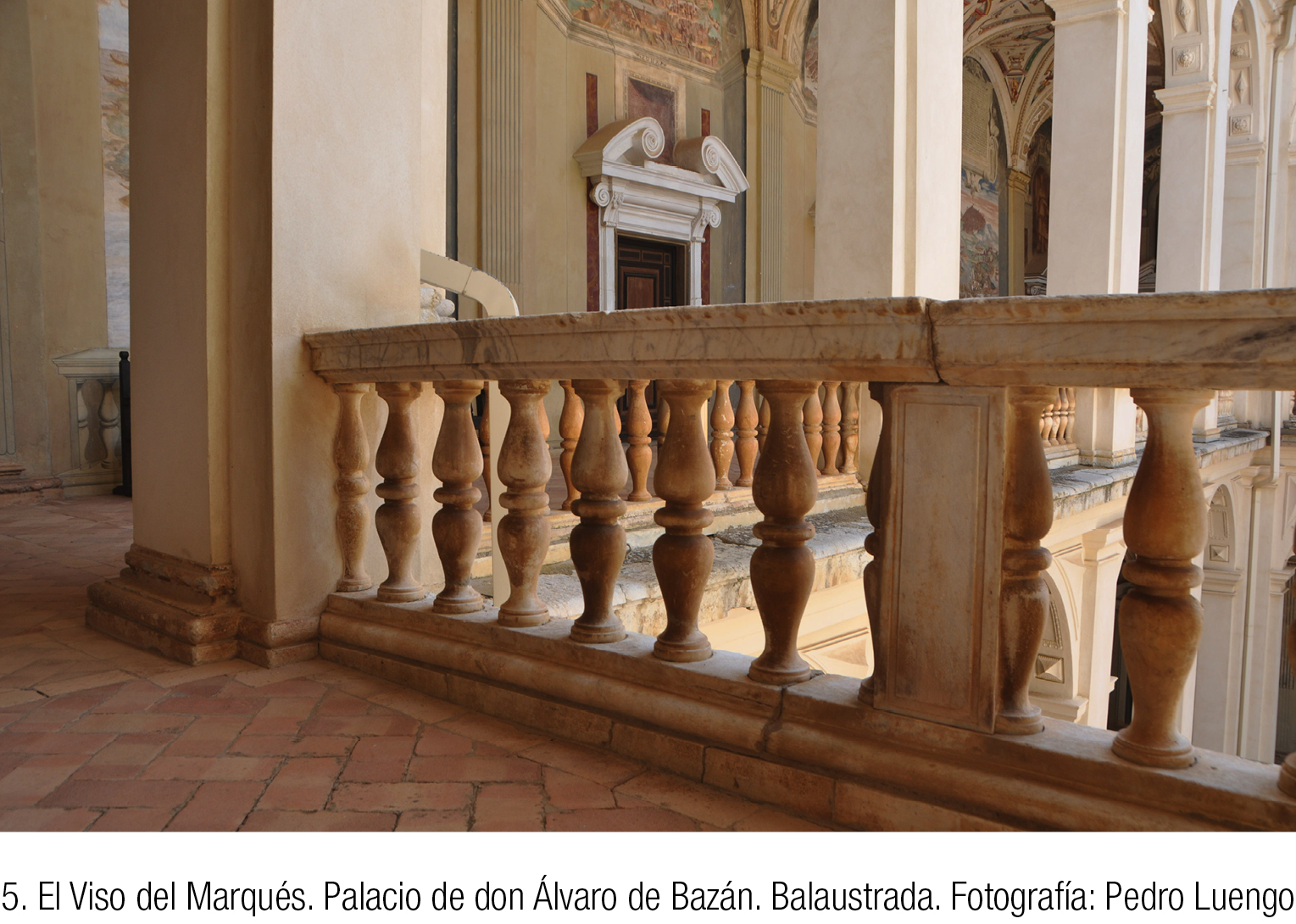 En un total de veinticinco cajas venían embalados balaustres, sin especificarse cuantos contenía cada una de ellas. No obstante, por el elevado número de los cajones cabe sospechar que en ellos se albergaba el conjunto de los que integran las barandas de las galerías superiores del patio, pudiendo haber también recogido los destinados al balcón de la fachada principal, un elemento que al parecer incorporó Castello al diseño original, partiendo de modelos genoveses7. Ninguna alusión hay en el documento a los semibalaustres arrimados a las pilastras de ambos extremos de la baranda, ni a los adosados a los pies derechos dispuestos al centro de ellas. Sin embargo, cabe sospechar que dichas piezas también estuvieran embaladas en los mismos cajones [5].