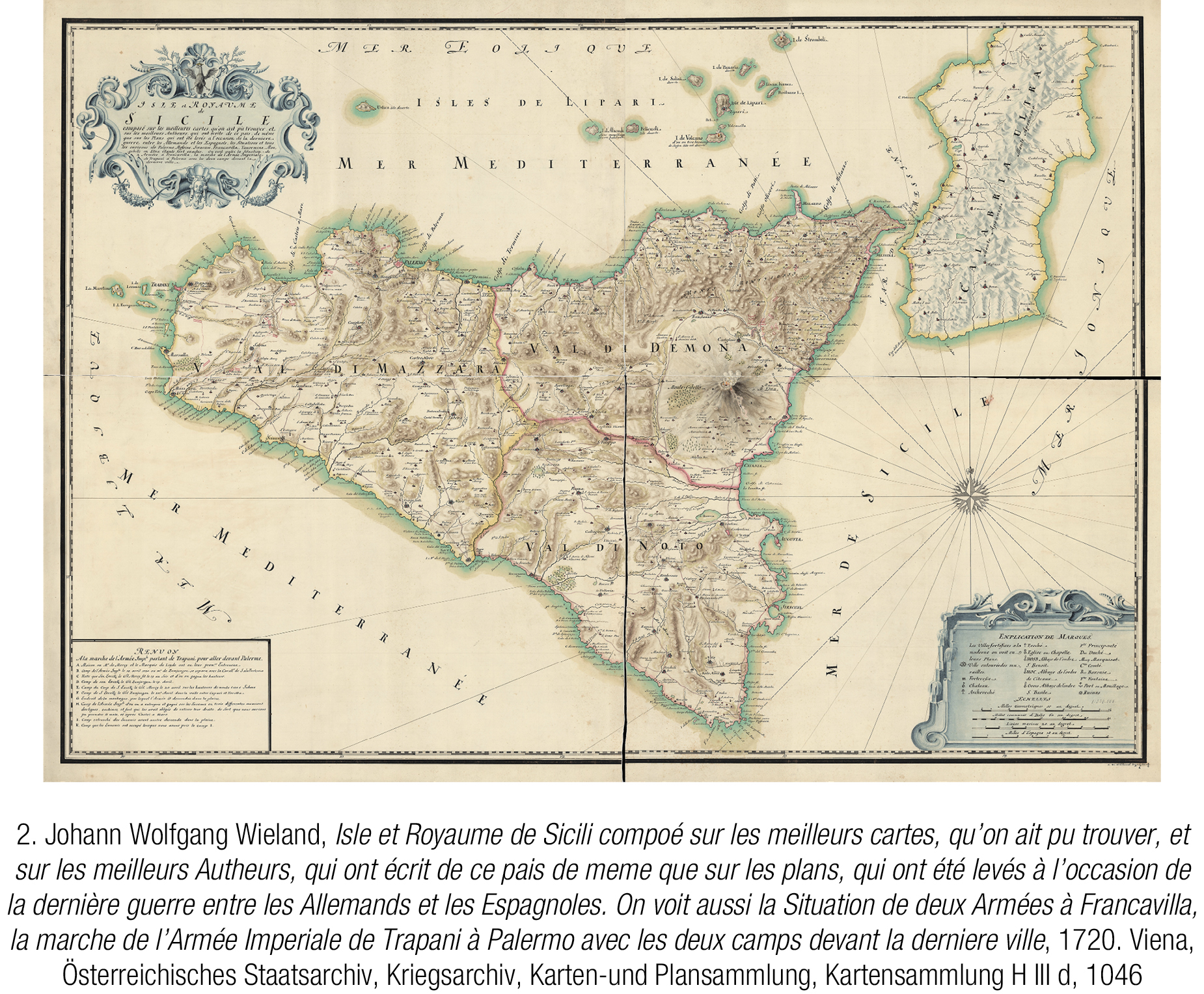 Durante el siglo XVIII, la producción cartográfica militar urbana y el planteamiento de nuevos proyectos por parte de los técnicos al servicio del emperador austriaco siguen manteniendo el mismo propósito e idéntica necesidad que en las épocas anteriores. Más allá de las distintas habilidades de aquellos que intervinieron en la ejecución de los mapas urbanos, era imprescindible acudir personalmente a la inspección del territorio, de las ensenadas y de las estructuras defensivas. En Sicilia, durante el periodo que nos atañe, la realización de nuevos levantamientos topográficos fue ideada, como hemos apuntado anteriormente, por parte de un equipo de ingenieros coordinados por Schmettau, nombrado en Viena intendente general del ejército austriaco por parte del príncipe Eugenio de Saboya y que, a raíz de este nuevo encargo, se trasladó a Sicilia en 1719 y permaneció aquí hasta principios de 1720. Durante este periodo estuvo ayudado por otros técnicos, como los ingenieros y hermanos Domenico y Michelangelo Blasco, que emprendieron nuevos levantamientos topográficos, astronómicos y geodésicos in situ que se revelaron muy útiles para el acantonamiento de tropas, la defensa de los frecuentes asedios o para mejorar las defensas de la isla. Uno de los resultados más destacados de Schmettau, después de haber recorrido el territorio entre 1719 y 1720 fue confeccionar en Viena dos ejemplares del nuevo mapa geográfico de Sicilia [1], con la ayuda de su fiel colaborador, el ingeniero Domenico Blasco (Manfrè, 2022: 1583-1585). El mapa debía responder a nuevos levantamientos in situ y, sobre todo, debía remplazar el mapa anterior de Sicilia [2] realizado en 1720 por el ingeniero austriaco Johann Wolfgang Wieland (1673-1736/1757) porque su labor se había basado únicamente en la recopilación y análisis de un conjunto de diez mapas sicilianos, ideados con anterioridad (Manfrè, 2022: 1578).