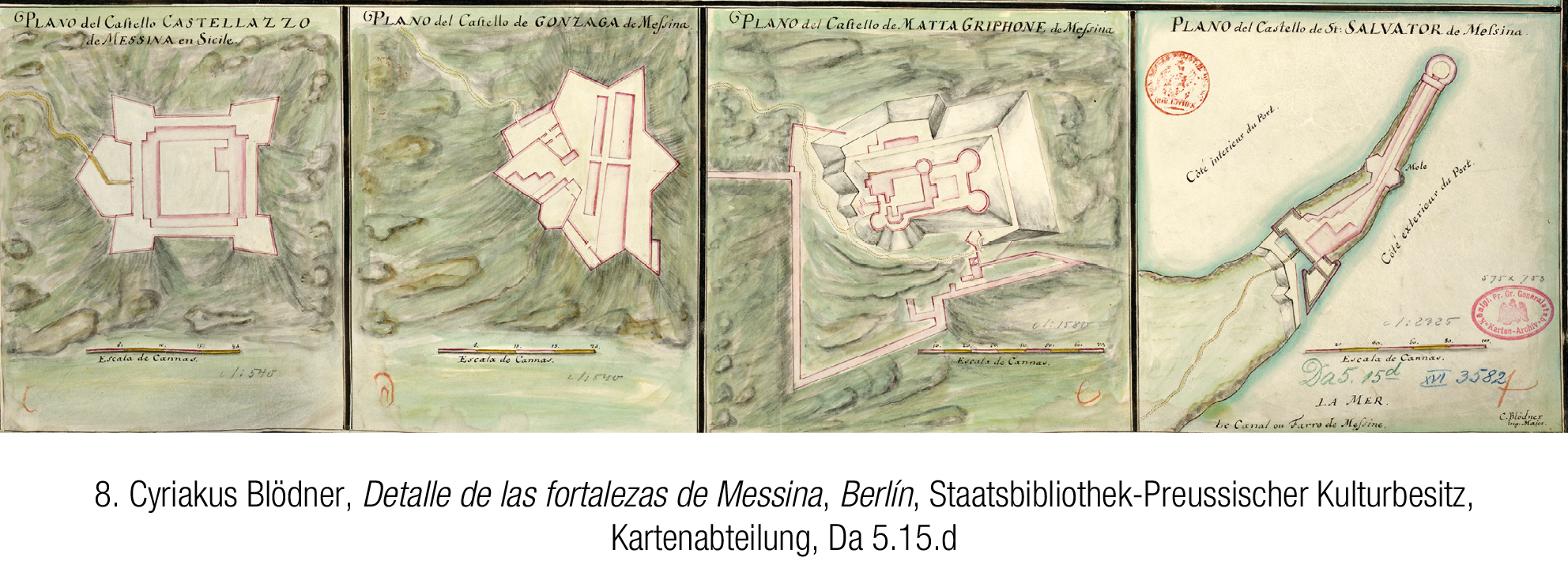 En cuanto a la ciudad de Milazzo, ubicada en la costa norte de la isla, está representada por dos dibujos. En el primero [5] Plan de Melazzo avec les environs et le cap de Lemazzo en Sicile. L’Anne 1718 avant le siege, a la representación gráfica de Milazzo, Blödner añade, en la parte inferior del dibujo, cuatro planimetrías bastantes aproximadas que se refieren al castillo Ursino de Catania, a éstas siguen las planimetrías de la ciudad de Catania, el castillo de Brucula (Agrigento) y, por último, el plano de Trapani, ambos fechados 1719. Milazzo está representada con su perímetro amurallado en su parte más elevada (la ciudad alta) indicada en la leyenda con la letra D «La Ville Murée» y la ciudad baja indicada con la letra F, también conocida como el Cabo. Los elementos figurativos se limitan a algunas zonas de arbolado y al coloreado de los campos de cultivo. Se alude también a los caminos que recorren el territorio y a la costa articulada por pequeñas ensenadas y barrancos. Entre los elementos defensivos se representan los edificios más emblemáticos, es decir, su primitivo castillo de época normanda y la torre del homenaje, el llamado fuerte Sant’Elmo. Se indican también los alojamientos para las guarniciones y las baterías. En el número 18 de la leyenda, coloreada en amarillo, según la diferenciación cromática utilizada para indicar espacios (Warmoes, 2008: 55-66), tanto proyectados como construidos, se alude a los «vestiges des fortifications faites par les Espagnols à l’occasion de Guerre de Messina». Con toda seguridad estas notas se refieren a las fortificaciones realizadas durante la rebelión de la ciudad de Messina contra la Corona española ocurrida entre 1674 y 1678. Durante estos años de inestabilidad los virreyes procuraron que Milazzo se convirtiese en una especie de cuartel general para coordinar las operaciones militares españolas encaminadas a la reconquista de la ciudad del estrecho.