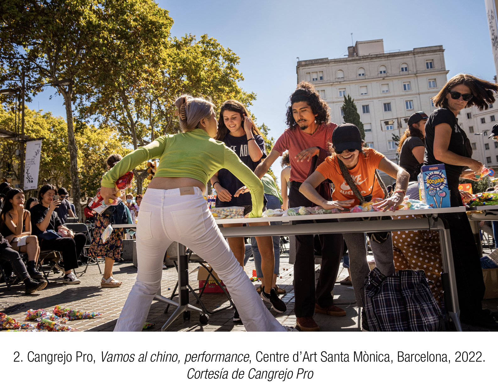 La performance colectiva Vamos al chino deviene un dispositivo para denunciar la sinofobia de la sociedad española y se ha llevado a cabo en diferentes enclaves, adaptándola en cada uno de ellos, como en el Centro de Creación Artística Matadero en Madrid, dentro del II Encuentro de la Diáspora China en España (2 de abril de 2022), delante del Centro Arts Santa Mònica en Barcelona (2 de octubre de 2022), en el marco de los VIII Encuentro Cultura y Ciudadanía en Sevilla (26 de octubre de 2022), en el Festival de Cultura Feminista en San Sebastián (2 de diciembre de 2023) y en el Museo del Traje de Madrid (20 de junio del 2023). Me centraré en la acción llevada a cabo en Barcelona [2], frente a una audiencia especialmente heterogénea. Cangrejo Pro, en la convocatoria de la acción, enuncia el deseo que esta pieza siga fermentando en espacios públicos, en centros escolares y en espacios escénicos puesto que uno de los objetivos finales es interpelar a la sociedad.