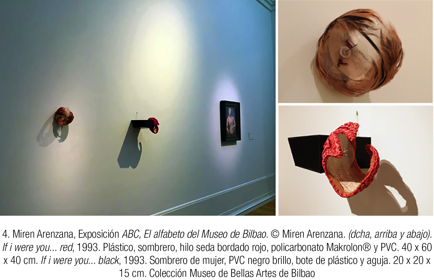 En los noventa se da una serie de obras «caracterizadas por la irrupción de lo cotidiano, que recupera el inconsciente femenino poniendo un especial énfasis en los aspectos materiales» (Aguirre, 2018: 93). Estrechamente relacionada con el citado centro Arteleku, encontramos a Miren Arenzana (Bilbao, 1965) mezclando en sus obras tejidos y materiales sintéticos (plásticos, medias de nylon, etc.) con plumas y técnicas habituales en la moda y las creaciones textiles (cosidos, bordados, etc.) [4] «cruzando el lenguaje del arte con prácticas asignadas al ámbito cultural-doméstico» (Moya y Arnaiz, 1993: 25).