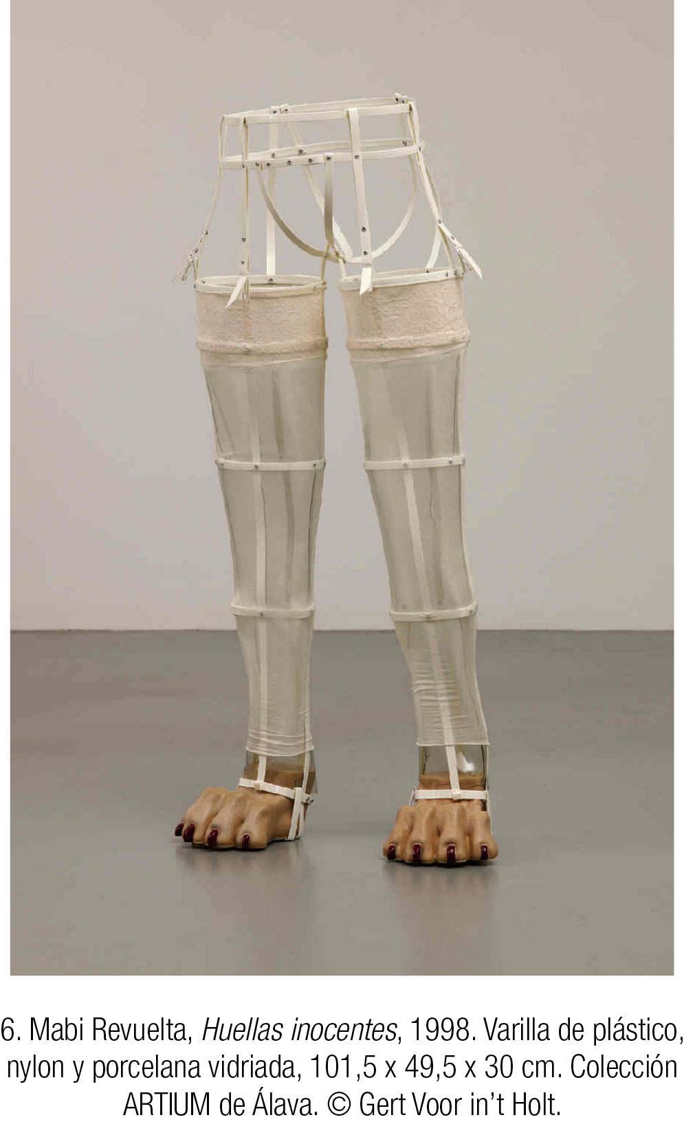 En directa alusión a esa afirmación encontramos su paradigmática instalación Mujeres sobre zapatos de plataforma de 1993 que forma parte de la colección de la Caixa13. En ella se muestran suspendidos del techo seis tocados realizados con materiales tan dispares que van desde tejidos de tul, plumas, rulos de metal hasta uñas de plástico con sus correspondientes seis pares de zapatos de los años setenta, generando conjuntos en los que la figura femenina está ausente, pero al mismo tiempo representada.