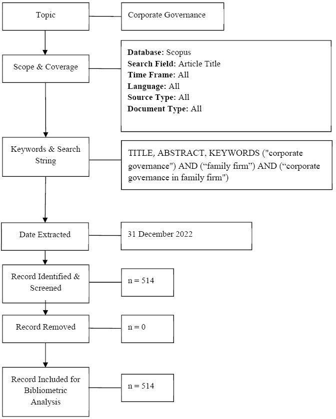 A search query was run on the main search interface of the Scopus database using the following search fields: “Article title”, “Abstract”, and “Keywords”. The terms “corporate governance” and “family firm” were included in the search. The search was carried out in December 2022 with the aim of identifying a wide range of academic documents published between 1998 and 2022. The search was carried out in December 2022 with the aim of identifying a wide range of academic documents published between 1998 and 2022. This timeframe of 25 years provides a comprehensive dataset that accurately captures the progression of corporate governance in family-owned enterprises throughout the years. The search turned up 514 documents as a result. Figure 1 displays our search strategy based on Zakaria et al. (2021). After that, the bibliometric technique was applied to all retrieved documents.