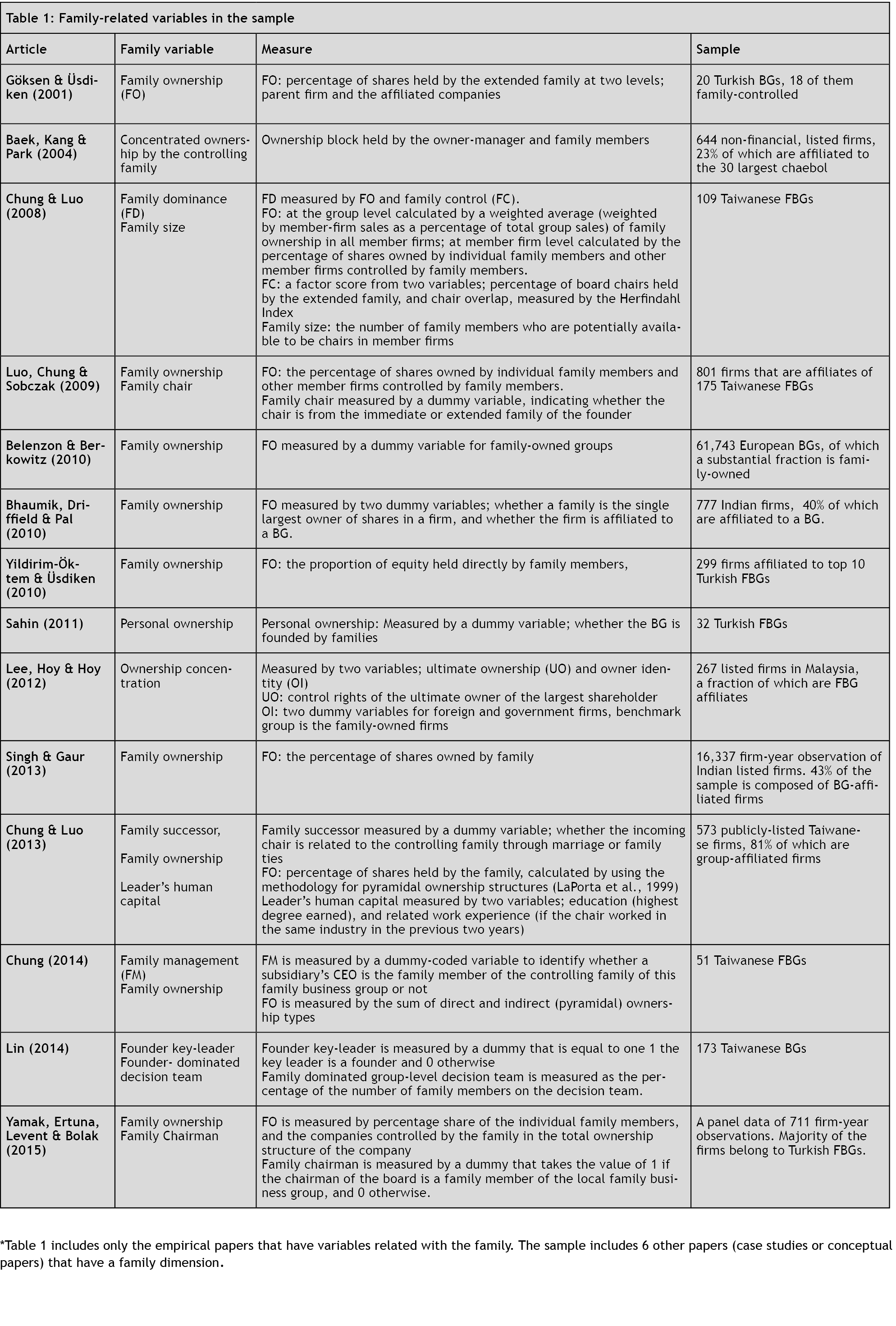 Among the 80 articles in the sample, there are only 19 articles that include a family dimension. In some of these, family variables are not central to the study, but they are used as control variables or to develop alternate hypothesis (e.g. Belenzon and Berkowitz, 2010). This, alone, shows the negligence of the family dimension in studying internationalization of FBGs. As can be seen in Table 1, variables used in these studies are mostly limited to family control through ownership and management. In the sample, there is only one empirical study (Chung & Luo, 2013) that went beyond and took leader’s human capital into consideration.