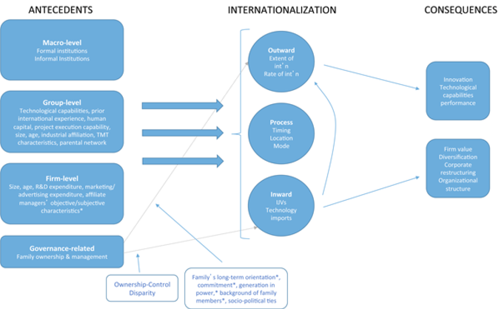 Potential antecedents of internationalization that have been taken into consideration for FBGs in the past studies can be categorized at three levels as institutional-, group- and firm-level. Both formal and informal institutions influence the extent and modes of internationalization. As the state remains to be a key actor in economies of emerging countries, changes in its policies significantly shape both the level and modes of internationalization. Although inward-oriented liberalization policies seem to intensify competition in the home market, they are also likely to be beneficial for FBGs since developed country-based MNCs choose them as partners in the IJVs they establish. FBGs also benefit more from outward-oriented liberalization policies as large enterprises with rich market and non-market resources as well as strong ties to the state. On the other hand, informal institutions such as familial and ethnic ties are also influential in mode and location choice such that FBGs prefer to invest in countries and establish partnerships in countries where they have informal ties. This, in turn, limits the geographical scope of FBGs internationalization.