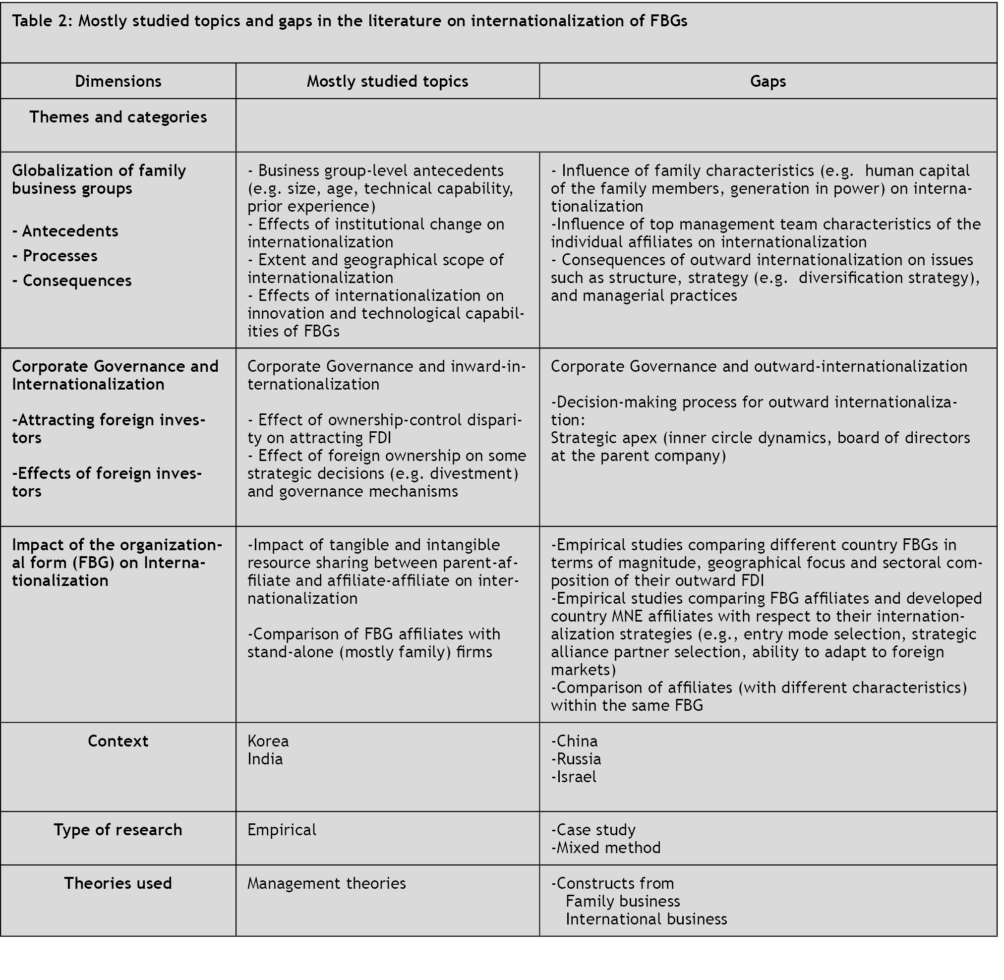 The main contributions of this paper are twofold. First of all, this literature review draws attention to a neglected form of family business, FBGs. As the family business field has been reaching its maturity, studying FBGs from a family perspective may provide a potential venue for future family business research. Second, the paper synthesizes the literature on internationalization of FBGs by proposing a model, pointing out the gaps in the literature, and providing suggestions for future research.