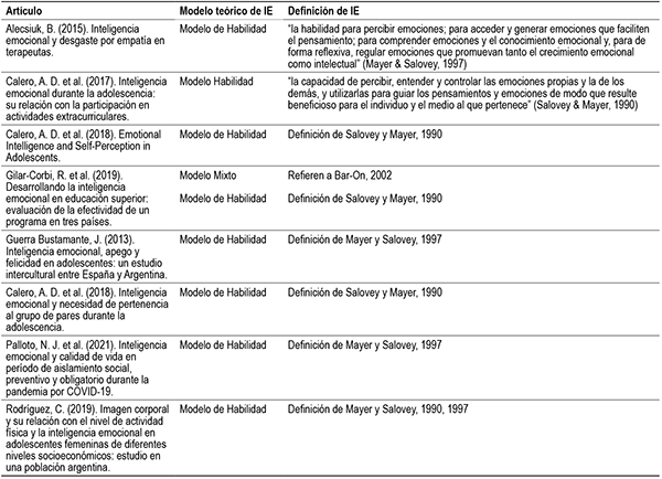 A su vez, se evaluaron los modelos teóricos desde los cuales se posicionaron los investigadores a la hora de definir el concepto de IE (ver Tabla 2). De este análisis se obtuvo como resultado que 7 artículos adoptaron el modelo de IE como habilidad, con excepción de una investigación donde los autores optaron por considerar a la IE tanto desde el modelo de habilidad como del modelo mixto.