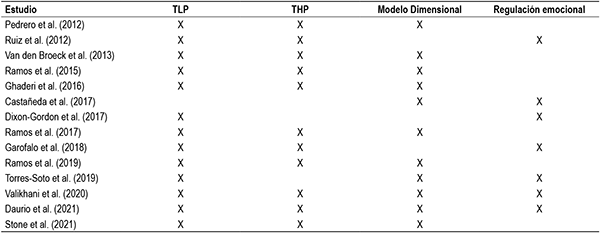Una vez seleccionados mediante el proceso de cribado un total de 14 artículos, se procedió a recoger información sobre la fecha de publicación, la presencia de ambos trastornos, el modelo dimensional avalado científicamente y las estrategias de RE que emplean las personas con rasgos de personalidad patológicos. Esta información constituyó las variables diana que nos informaban acerca de la viabilidad de seleccionar el estudio analizado. Una vez realizado el cribado de artículos, los resultados extraídos fueron agrupados en las conclusiones derivadas de las correlaciones y análisis de regresión. Al sintetizar esta información se observa qué datos arrojados por las investigaciones eran concordantes.