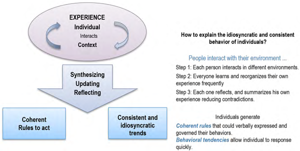 People accumulate knowledge through various forms of learning, influencing responses in new contexts. Learning from others and interacting with diverse contexts shape individual behavior. Previous learnings impact present and future responses. Behavioral tendencies emerge from interactions within a context, influencing future responses. Learning accumulates, adjusting behavior probabilities based on associations with stimuli. The integration of experiences is essential for effective responses in similar contexts. These behavioral tendencies enable swift responses aligned with task-specific motivations. Verbal descriptions form rules, aiding analysis, reflection, and decision-making. Rules also facilitate communication and performance justifications. Figure 1 summarizes the description of personality in the terms described.