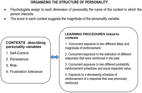 From the perspective of behavioral personality theory, there is no consensus on how to proceed to define the structure of an individual’s personality. However, we consider that it is possible to organize and explain the personality structure from two different perspectives: in terms of the set of contexts that describe personality dimensions (e.g. risk-tendency, persistence, self-control) and in terms of the type of learning through which the individual has incorporated their experience and their specific behavioral tendencies (i.e., perceptive and operant conditioning, modeling and their different procedures). Figure 2 summarizes this proposal, which will be discussed in more detail below.
