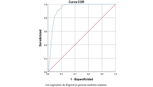 Los valores de sensibilidad y especificidad fueron graficados por medio de una Curva COR (Curva de Rendimiento Diagnóstico), observando que el punto de corte de 22 es el que parece más adecuado para identificar a los sujetos más susceptibles a los modelos estéticos corporales (Figura 2), ya que presentó el mejor equilibrio entre sensibilidad (66%) y especificidad (100%). A partir de esto, se puede afirmar que el CIMEC-26 con el punto de corte de 22 mostró una adecuada especificidad y sensibilidad para mujeres mexicanas (Ver tabla 7).