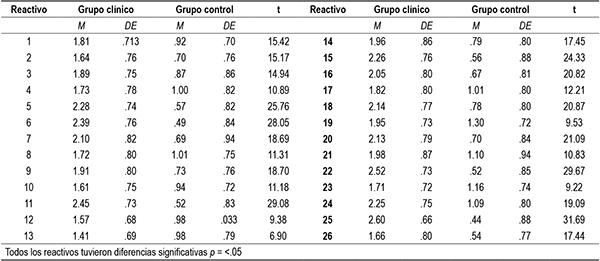 Comparación entre grupo clínico y grupo control entre cada reactivo del CIMEC-26.