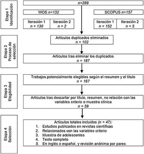 La Figura 1 muestra el proceso de revisión a través de cinco etapas: (1) etapa de identificación: se realizó la búsqueda de artículos en las metabases Web of Science y Scopus, publicados entre los años 2011 y 2021, con las palabras claves “emotional intelligence”, “emotional competences“, “psychological well-being”, “flourishing”, “happiness”, “life satisfaction”, “positive affect”, “negative affect”, “adolescent” y “youth”, en inglés y en español; (2) etapa de proceso de selección: se eliminaron los estudios duplicados en más de una metabase; (3) etapa de elegibilidad: se eliminaron los estudios que no tenían en su título y/o resumen las palabras clave de búsqueda, que no respondían al objetivo de esta revisión, o estudiaban una muestra clínica; (4) etapa de selección: se seleccionaron los estudios publicados a texto completo en inglés o español en revistas científicas con revisión por pares, relacionados con las variables criterio, y realizados con muestras de personas de cualquier etnia o género cuyas edades oscilaban entre 10 y 19 años; (5) etapa de sesgo: dos revisores evaluaron los títulos y resúmenes, y acordaron qué artículos debían incluirse en esta revisión.