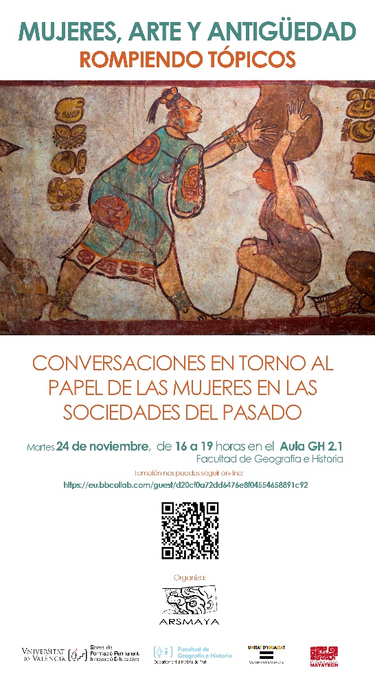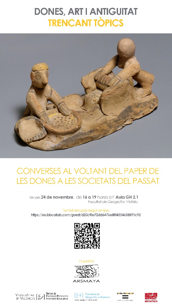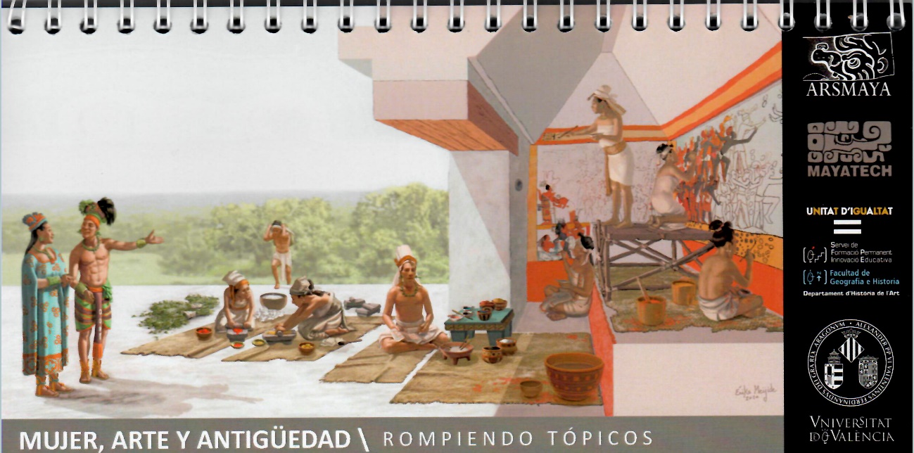 Una de las novedades del nuevo Plan de Estudios, también conocido como Plan Bolonia, en nuestro grado fue la organización de actividades complementarias en las diferentes asignaturas, a través de las cuales es posible organizar jornadas científicas, talleres, visitas a museos y exposiciones u otras actividades vinculadas con temas de especial interés y actualidad para la materia que se imparte. Estas, además, pueden ser transversales a otros programas y ayudas, como por ejemplo los impulsados desde la Unitat d´Igualtat de la UV o desde el Servicio de Formación Permanente e Innovación Educativa (SFPIE) de esta misma Universidad. En este sentido, desde el grupo de investigación Arsmaya, siempre se ha procurado proponer acciones en el marco de esas actividades complementarias que estuvieran íntimamente relacionadas con las investigaciones y actividades llevadas a cabo por sus miembros. Dado que, como decíamos, el estudio de las mujeres del pasado es una de las líneas de investigación desarrolladas en este grupo, varias de estas actividades han estado dedicadas a esta temática, y especialmente a las mujeres mayas, ya que el estudio de esta antigua civilización prehispánica posee un importante protagonismo en dicho grupo de investigación. No obstante, la aplicación de la perspectiva de género al estudio de las manifestaciones artísticas de otras culturas antiguas del Viejo Mundo ha sido, como se ha visto, una constante en las experiencias docentes en el aula por parte de todo el equipo de Arsmaya, lo que ha llevado a la incorporación en el grupo de nuevas especialistas en materia de estudios de género en el área del Mediterráneo.
