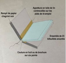 [8] Une couture de brochure est une couture simple réalisée à l’aide d’un fil et d’une aiguille, ne nécessitant pas de supports de couture et permettant l’assemblage d’un seul ou de plusieurs cahiers.