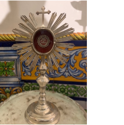 Por todo, de un tiempo a esta parte la difusión de la veneración del beato Diego ha ocasionado la proliferación de obras artísticas que refrendan su importancia en Málaga capital. Es el caso del patrimonio que atesora la congregación, donde podemos encontrar un relicario del siglo XIX [Fig. 5], austero en ornamentación, de leves incisiones y con una forma circular ornada con rayos solares rectos donde se alberga la reliquia, rematada con una cruz. Esta se acompaña de documentación acreditativa de veracidad de la misma, clasificada como ex ossibus desde el 31 de mayo de 1981, firmada por fray Bernardinus a Senis, general postulador de los frailes menores capuchinos[7].
