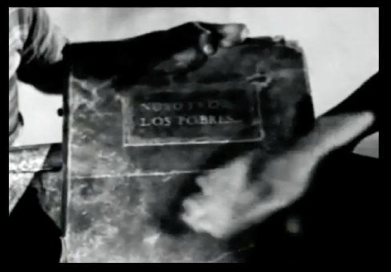 La película comienza parodiando un recurso narrativo clásico. Como si de un cuento de hadas se tratase, el título de la película aparece escrito en un libro de tapa gruesa, recurso que sitúa el discurso en una ficción muy concreta, y que sin esfuerzo puede remitir al comienzo del clásico Nosotros los pobres, de la que hay múltiples citas y alusiones explícitas, en toda la película de Estrada. En Nosotros los pobres (F1), el libro lo encuentran dos niños harapientos en un basurero, y sirve como recurso más estético que narrativo, para introducir los créditos de la película. Al encontrarse en la basura, sucio y desvencijado, se supone fuera de la oficialidad, un relato desechado por la sociedad, como sus propios personajes, y remite a una enunciación ubicada desde el relato autobiográfico de los pobres, lo cual se subraya en el uso del “nosotros” en el título. Por su parte, aunque la película también se sitúa en clara complicidad con las personas en situación de pobreza y marginalidad, en Un mundo maravilloso (F2) el relato está construido en tercera persona, y el libro aparece como dispositivo de narración omnisciente, desde el uso de la ironía, tanto en el desarrollo de la historia como en el desenlace, por ejemplo, desdiciendo o anticipando en la narración escrita en el libro lo que los personajes creen o esperan a lo largo de la película. Pero volviendo a lo que sugiere el comienzo meta-narrativo, tanto el libro como el término “mundo maravilloso” evocan un relato de ficción, ¿quizás una utopía? Efectivamente, esta idea se refuerza al leer en la primera hoja del libro la fórmula canónica de los cuentos tradicionales de fantasía: “Érase una vez” que coloca al espectador en un relato fantástico infantil, sin una ubicación espacio-temporal determinada, señalando que se desarrolla en “un futuro no muy lejano”. Se observa que se trata de una parodia que compara el discurso hegemónico[5] con un cuento infantil de fantasía. La enunciación parodia aquí el relato que la oficialidad cuenta al pueblo para que éste duerma (y sueñe) tranquilo, desde el humor que delata y desnuda las falsas apariencias.