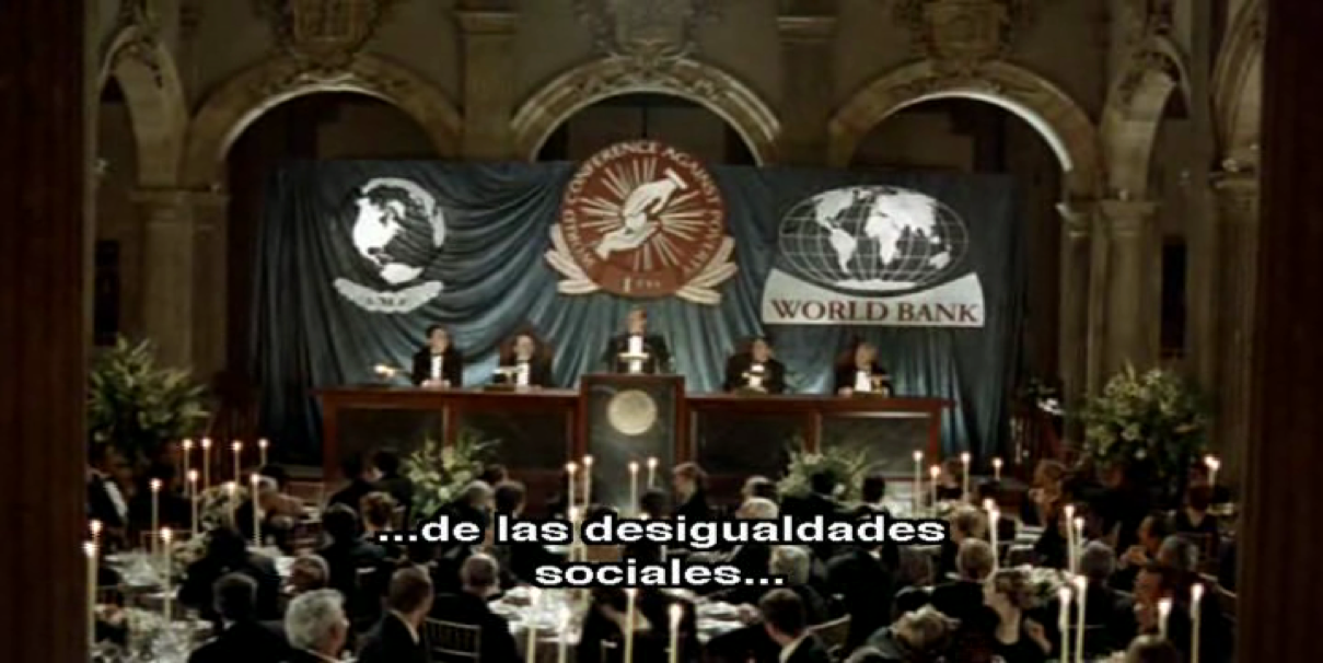 En este lugar tan saturado de significados, se celebra un congreso internacional contra la pobreza, oficiado por el Banco Mundial. El ministro de economía mexicano, un hombre blanco, de mediana edad, ataviado con traje y pajarita, pronuncia un discurso en un inglés fluido, aunque con acento mexicano, sobre la situación del país. El público, en su mayoría de tez blanca y rasgos occidentales, escucha ensimismado e inexpresivo el discurso, desde la seriedad que caracteriza a la oficialidad (F4). El ministro afirma que México fue un país caracterizado por la “desigualdad social”, pero que gracias a la “guerra contra el hambre”, llevada a cabo con la ayuda del “libre mercado” capitalista, “la globalización” y la colaboración de sus socios, a los que alude implícitamente, sobreentendiéndose que hace referencia a grandes corporaciones económicas internacionales y a países ricos, especialmente a Canadá y Estados Unidos, que aparece enguyendo a México (excluyendo Suramérica) en el logo a la izquierda del ministro (F4).