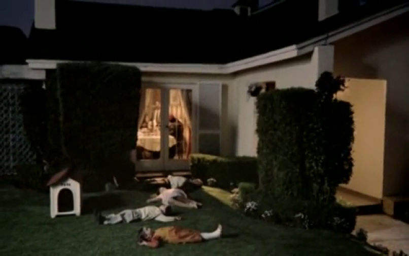 ver la entrada de la casa y el jardín. Mientras emerge nuevamente la voz de Armstrong cantando What a Wonderful World el plano se sigue abriendo mientras aparecen uno a uno, los cadáveres de todos los miembros de la familia ejemplar, que yacen en fila sobre el césped frente a la puerta de la casa.