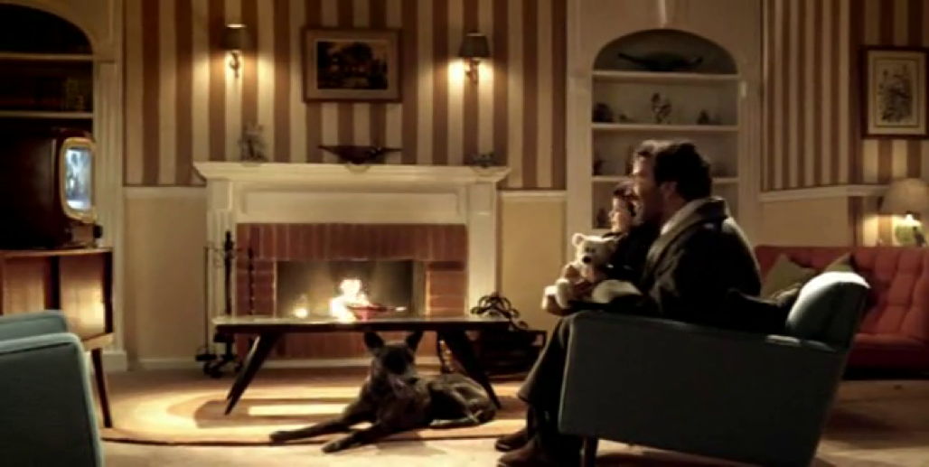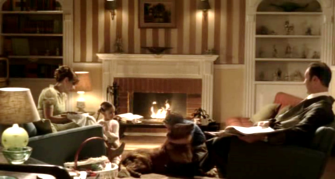 A continuación, la voz de Louis Armstrong cantando What a Wonderful World (1970) nos introduce con un travelling en el salón de una casa unifamiliar con jardín sobre la que llueve en la noche. Se trata de un hogar idealizado, donde una familia estereotípica, un matrimonio joven blanco, con dos hijos y un perro, disfrutan apaciblemente reunidos frente al fuego de la chimenea (F.5). La estética del mobiliario y vestuario evocan el cliché familiar estadounidense de la década de 1950, donde los roles de género están exageradamente marcados: el niño juega con su perro junto al padre que lee el periódico, la niña abraza sus peluches frente a la madre que borda, todo en el cronotopo de felicidad hogareña mainstream al calor de la chimenea que marca el centro de un cuadro armoniosamente simétrico.