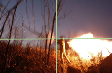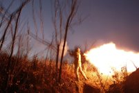 En relación con los elementos lumínicos, y siguiendo la estela del fuego, da lugar otro eje de oposición que enfrenta la tenue y uniforme luz natural de un sol caído con el fogonazo llameante de la explosión surgida del lanzacohetes. Esta detonación produce una luminosidad artificial muy fuerte que, a diferencia de la suave iluminación natural, crea grandes contrastes entre luces y sombras, estableciendo puntos de contraluz, como en las siluetas de los árboles.