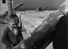 De lo que no puede caber duda es de que el poder de dicho narrador (inextricablemente identificado aquí con el gran imaginero que controla el contenido, pero también el tamaño, la distancia y la posición de las imágenes que vemos), pese a su aparición más comedida y limitada al arranque, no ha variado desde ¡Bienvenido, Mister Marshall!: nos presenta el faro y a algunas mujeres y un niño del pueblo reparando las redes de pesca, y se aleja en planos más y más elevados y distantes para mostrarnos la totalidad cerrada y compacta del mismo (“desde lejos parece una fortaleza”), sensación de aislamiento e insularidad multiplicada con respecto a filmes anteriores por la situación de Peñíscola en un tómbolo rocoso que se adentra en el mar y coronada por un castillo. “En otro tiempo lo fue” —prosigue el narrador, bien poco respetuoso con las heroicidades militares (del pasado)—, “pero de las guerras antiguas hoy solo quedan los juegos de los niños” (planos de los pequeños balanceándose en un cañón antiguo o escondiéndose detrás de otro) “y unos oxidados cañones que aquí sirven para esto, para esto o… para esto” (en varios planos la cámara se mueve mostrando como los cañones son usados para amarrar una barca de pesca, secar la ropa o incluso como lugares donde orinan los niños, hasta que el propio narrador le llama la atención: “¡Niño!”) (F7).