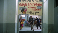 Por otro lado, destaca el uso expresivo del fuera de campo. Si la cámara y los personajes se mueven sin parar modificando el encuadre, también, necesariamente, revalorizan la capacidad narrativa de la parte del espacio que queda fuera de sus márgenes. Es decir, lo que no se ve, pero sigue sucediendo. En el ejemplo del sacrificio del burro en el episodio La muerte y el leñador de Las cuatro verdades (1:11:21 / 1:13:27) [2:06], el público no ve lo que ocurre dentro del matadero, pero sí es consciente de ello mientras que acompañamos al niño –que somos nosotros, los espectadores– al que han obligado quedarse fuera del edificio.