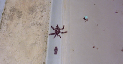 De forma semejante, el espacio remarca su función retórica, en comparación con el montaje externo convencional, cuando se muestra en un plano de larga duración. Figuras como la metonimia y la metáfora vienen determinadas por la variedad de formas de representar el espacio cuando no hay límites de escala o focalización. Así, la toma larga con la angulación cenital en el final de ¡Vivan los novios! (01:19:03 / 01:19:32) [00:29] convierten a la comitiva del funeral, vista desde el cielo, en una monstruosa araña. Este sentido icónico, simbólico de ciertas imágenes –Berlanga cuida con esmero el último plano de cada película– es una constante en el diseño de sus planos secuencia.