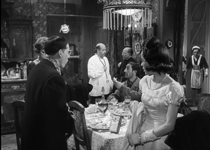 4. El rasgo más característico de esa comedia es el conflicto coral: los seres humanos formamos parte de grupos –familiares, laborales, etc.– con los que estamos obligados a relacionarnos. La lucha entre individuo y colectivo se presenta así en toda su crudeza. Las necesidades y deseos de los protagonistas chocan una y otra vez con la cantidad de congéneres con los que tiene que compartir encuadre y hacerse un hueco a codazos para que no le pisen su frase o le tapen su gesto. Igualmente, el individuo está obligado a pertenecer, a sumarse a la mascarada colectiva que nos convierte a su vez en lobos para otros individuos. Berlanga utiliza en contadas ocasiones el primer plano para enfatizar alguna expresión o respuesta: se siente más a gusto remarcando esa interacción, esa lucha abierta entre seres humanos en escalas de planos más amplias –aun a costa, a veces, de despersonalizar, de alejarse afectivamente de los personajes–.