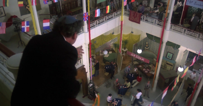A su vez, no hay límites en cuanto a la ubicación de sujetos u objetos en ese marco escenográfico libérrimo: los personajes pueden pulular por cualquier lugar sin atender a la horizontalidad (eje X) propia del cine, sino que pueden interactuar también en el plano vertical (eje Y), por ejemplo, empleando a la vez varios pisos de un edificio y relacionando personajes que están arriba con otros que están abajo, como en la fiesta de Patrimonio nacional (00:57:22 / 00:58:57) [01:35] o en las galerías de Todos a la cárcel (00:42:11 /00:44:32) [02:21]. Igualmente, ese espacio continuo que no respeta ninguno de los cuatro lados del perímetro del encuadre puede prolongarse indefinidamente hacia el fondo (eje Z) como en los planos del rodaje del anuncio de La boutique (00:23:44 / 00:27:01) [03:17] o del velatorio de ¡Vivan los novios! (01:03:55 / 01:05:06) [01:11]. En ocasiones, parece como si Berlanga buscara sitios especialmente extraños, que den juego, para utilizar cualquier área del espacio, por estentórea o surrealista que resulte, y planificar la escena en torno a dicha localización.