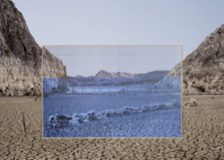 F8. Comportamiento para un simulacro 8, 2017-2018. Colour photograph, 100 × 140 cm. Mural installation carried out at the Porma Reservoir (León) during the 2017 drought. © Antonio Guerra.