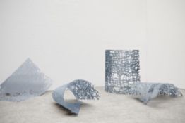 F6. Elevar la tierra, desaparecer. 2021-2022. Six production and printing devices, pigments, and printing powders. UV ink on acrylic. Photographs of arboreal structures in the Gossan–Copper tailings pond in Huelva. Acrylic and liquid. Dimensions: 47 × 26 × 25 cm. © Antonio Guerra.