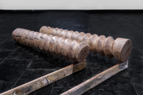 F5. De continuo lo inestable, 2021-2022. Archimedean extraction screw (wood), an ancient piece of equipment. 35 mm negatives from archival mining documentation in León, Asturias, and Huelva, plus acetates and prints on twill. © Antonio Guerra.