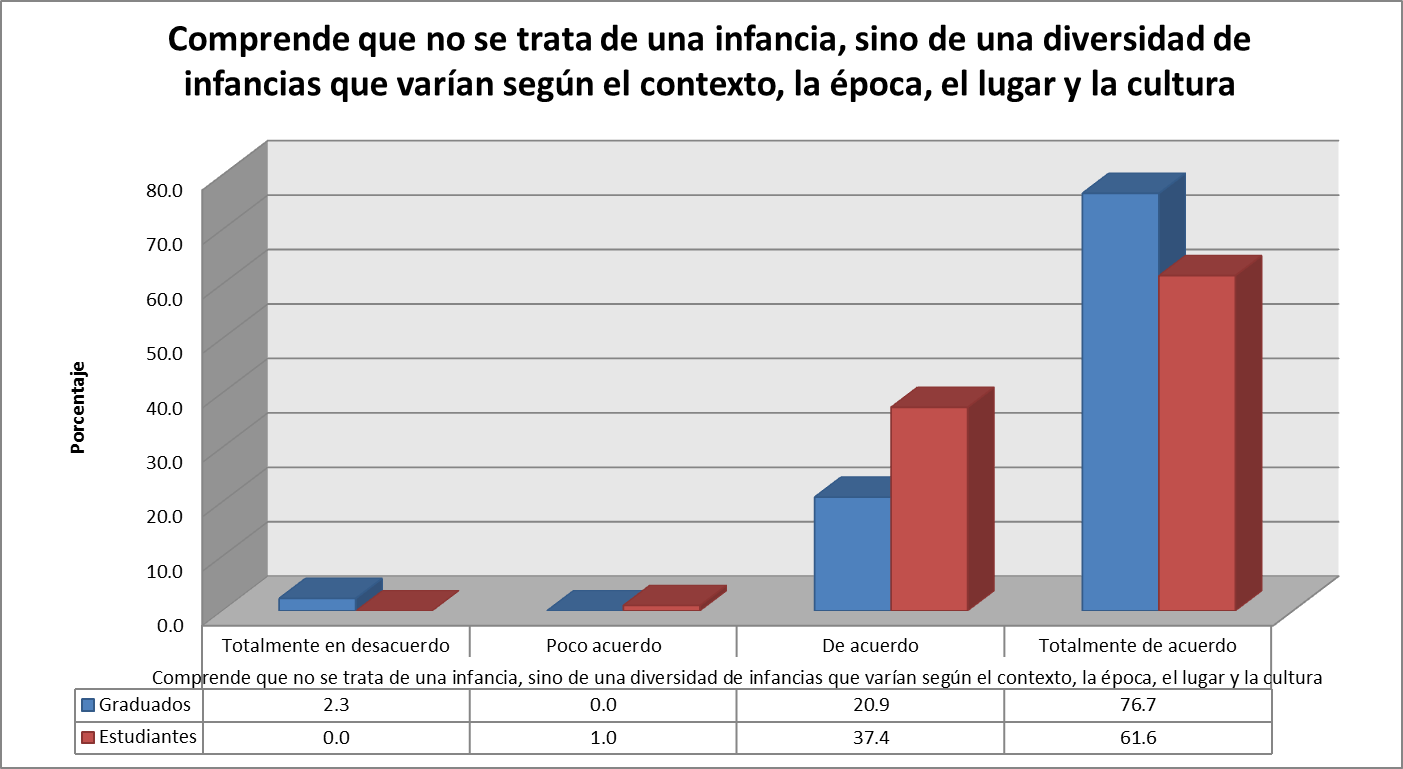Definir la infancia más allá de una etapa biológica, como un fenómeno social, implica dejar de lado hablar de una infancia, para darle paso a las infancias, en plural, ya que es posible encontrar tantas infancias como contextos. En este orden de ideas, al interior del programa de Pedagogía Infantil UNIMINUTO, estudiantes en 99% (De acuerdo y Totalmente de acuerdo) y graduados 97.6% (De acuerdo y Totalmente de acuerdo) valoran positivamente su capacidad para comprender que no se trata de una infancia, sino de una diversidad de infancias que varían según el contexto, la época, el lugar y la cultura. De los resultados cuantitativos se destaca: “Hablar de infancias en plural, en singular sería un atropello epistémico desde el punto de vista de las culturas entonces” (decano)